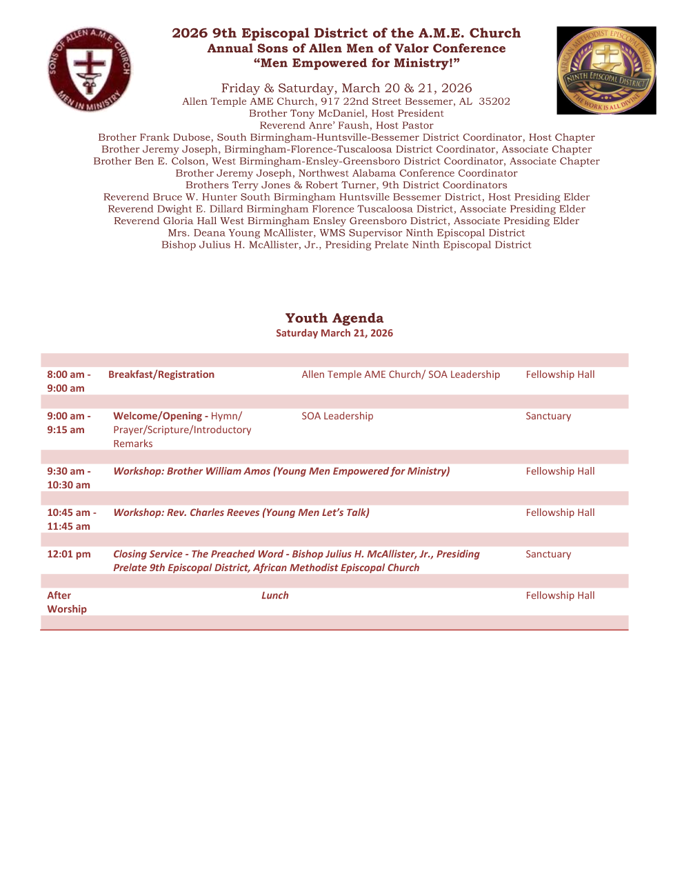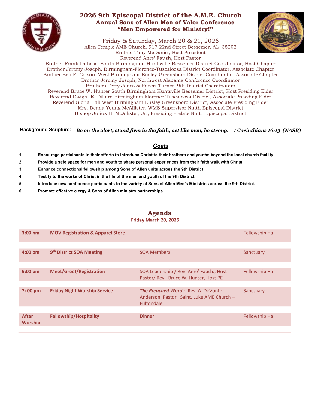 God has placed in the heart of the African Methodist Episcopal Church to establish a men's ministry within each level of the church, from the local to the Presiding Elder's District, to the Annual Conference, to the Episcopal District, to the Connectional Church. This ministry is to develop a men's fellowship (both clergy and lay) which will seek to address the needs for distinctive ministries for men who are faced with spiritual, social, political and psychological challenges, to equip men to follow the example of Andrew (St John 1: 41-42) who brought Peter to Jesus.