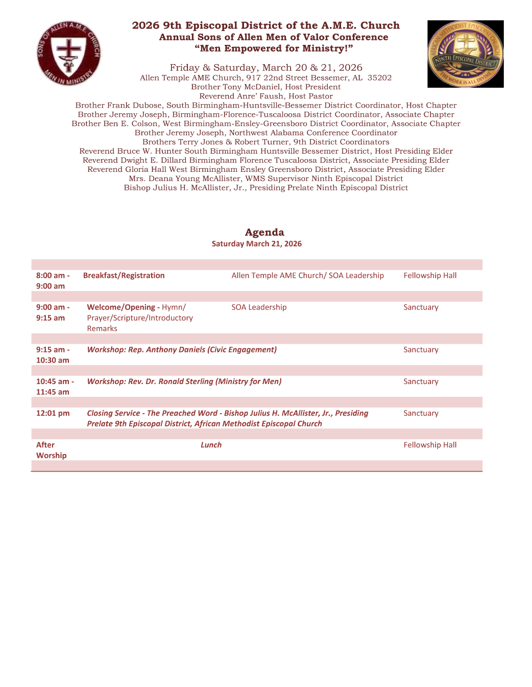 The Sons of Allen seek to encourage men to emulate the resolute and redemptive spirit of Richard Allen, our revered, ancestral patriarch who in negotiating for his freedom with slavemaster Stokely Sturgis, negotiated freedom for his unnamed brother as well; and to encourage men to implement ministries modeled by our founder, Richard Allen as he sought to meet needs in his community.