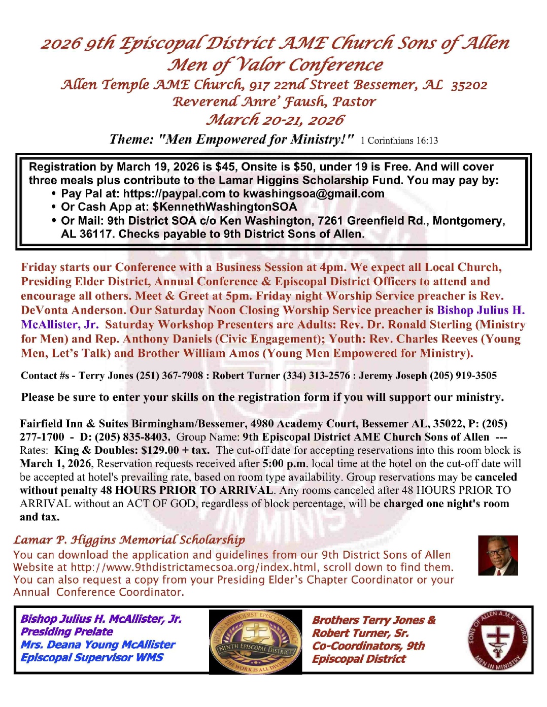 If you have confessed Jesus Christ as Lord of your life, then help us to be a blessing to your brothers. It is a good thing to help someone in this struggle called life. In your walk of life you will meet people that need help in various ways and you will find that you can’t do all that is needed because of limited resources. You may not have the knowledge, finances, physical strength, or even the desire (motivation) to provide the help needed. But, in the fellowship of the men’s ministry, together we can do more. So come and be a part of the Sons of Allen to strengthen our men’s fellowship to do more.