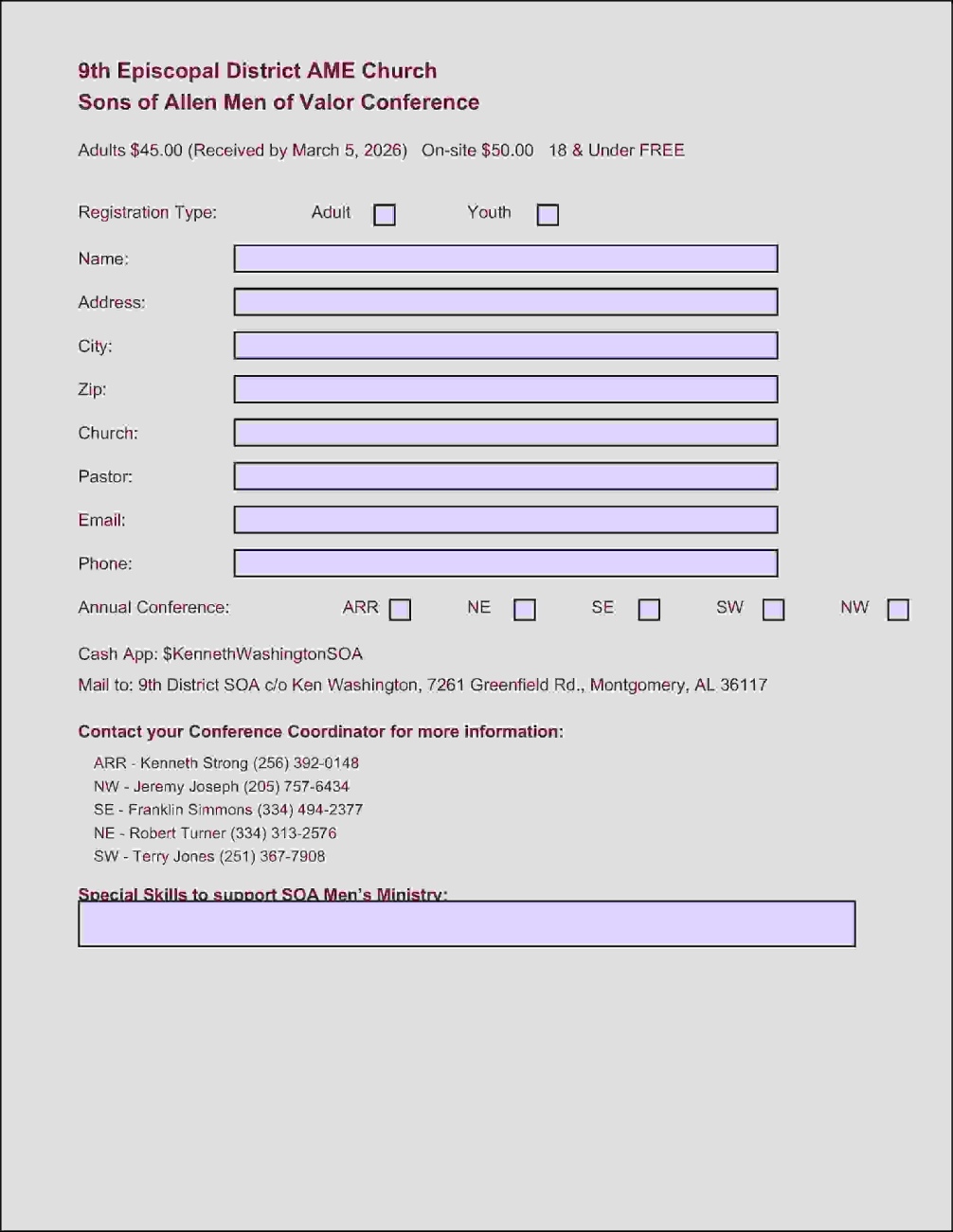 God has placed in the heart of the African Methodist Episcopal Church to establish a men's ministry within each level of the church, from the local to the Presiding Elder's District, to the Annual Conference, to the Episcopal District, to the Connectional Church. This ministry is to develop a men's fellowship (both clergy and lay) which will seek to address the needs for distinctive ministries for men who are faced with spiritual, social, political and psychological challenges, to equip men to follow the example of Andrew (St John 1: 41-42) who brought Peter to Jesus.