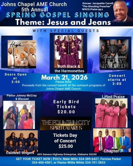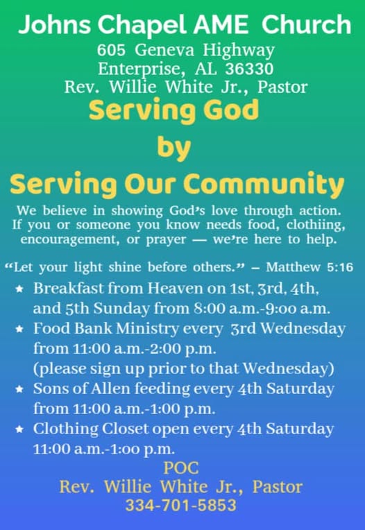 Johns Chapel in Enterprise Alabama is the spot. We start service